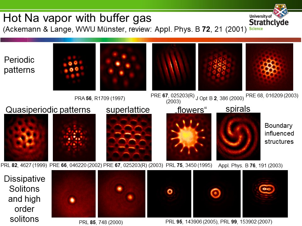 Nonlinear effects occur in many media and in many different configurations. Concerning the medium, we focus on experiments using sodium vapour. The nonlinearity is due to optical pumping. Beside technical advantages (high optical quality, easy variation of parameters over a broad range, high resonant nonlinearity) the benefit of using an atomic vapour is that the equations governing the light-matter interaction can be derived directly from quantum mechanics via the density matrix approach. A large buffer gas presure of molecular nitrogen ensures that atomic motion can be simply decsribed by diffusion and that depolarization from radiation trapping is negligible.Regarding the investigated configurations, investigations have been done in most of the situations in which spatial optical structures are known to occur. Since we are interested in the fundamentals, we work in a so-called single-mirror feedback system because of its conceptual simplicity.
