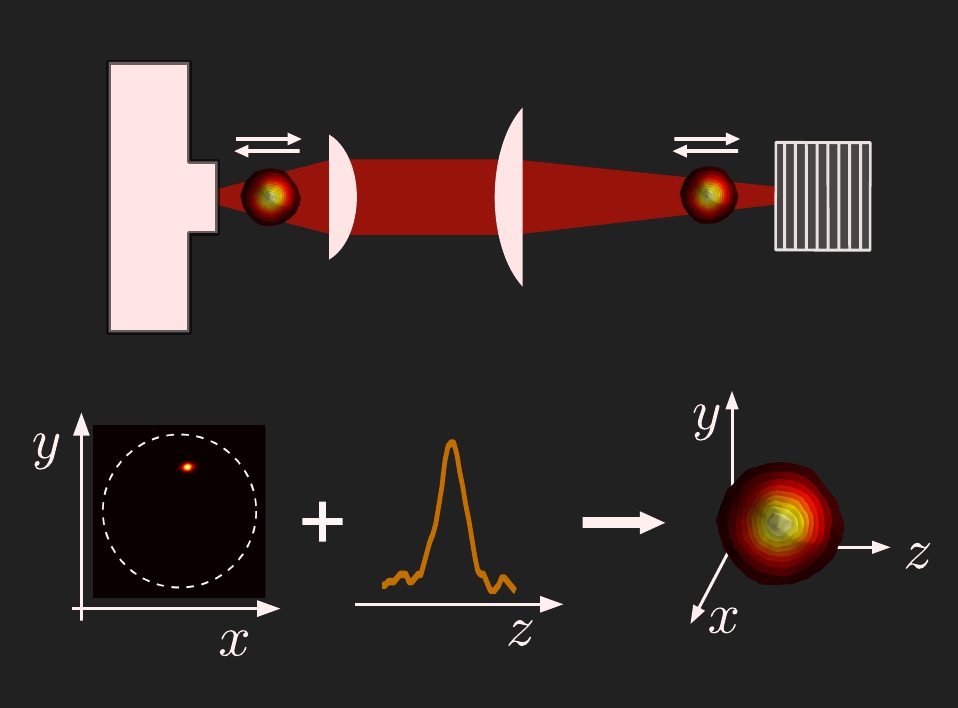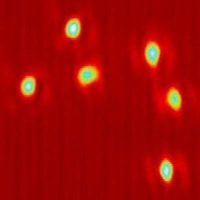 This figure shows the intensity distribution within the active area of the VCSEL. It demonstrates the independent switch-on and switch-off of two microlasers with an external control beam (arrow). Obviously, you can set and reset laser emission by optical means similar to setting and resetting an electronic flip-flop. The individual microlasers have a size of about 5 microns